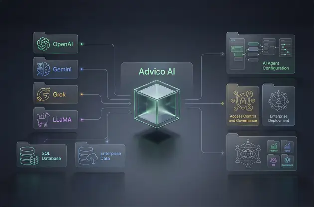 By securely connecting your existing LLM subscriptions — including OpenAI, Gemini, Grok, and LLaMA — with enterprise data sources like SQL databases, Advico AI enables you to deploy custom AI agents across departments such as Finance, Sales, HR, and Operations — without writing a single line of code.